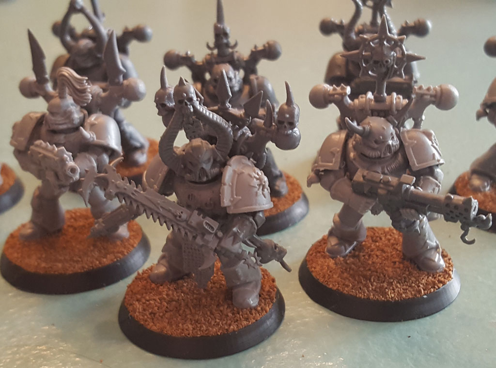 For the most part, all the regular Chaos Space Marines units I’ve ever built have gone right into Black Legion colors. Cult troops (Khorne Berzerkers, Plague Marines, etc.) got their cult army colors, but my regular Chaos Space Marines – including transposable units like Chaos Bikers and Havocs – all were painted in Black Legion colors. There were two reasons for this. First, Black Legion was my first Chaos Space Marine force, and my first Warhammer 40,000 army to boot. Second, the Black Legion fluff always indicated that some units could be open to operating with other CSM factions. So if I wanted Nurgle-marked marines that were not Plague Marines in my Death Guard force, I rolled in some of my Black Legionnaires. I did this even in the more WYSIWYG editions with no problem. However, when I started my Khorne Daemonkin force, I decided to do up some Chaos Bikers in the red-and-gold getup. And after playing some games using my Black Legion guys as Khorne-marked CSM, I started to get the feeling that the guys in black and gold looked out of place. I really wanted a more uniform looking force. So I decided I’d put together some CSM and paint ’em up the same as the rest of my Khorne Daemonkin army.
