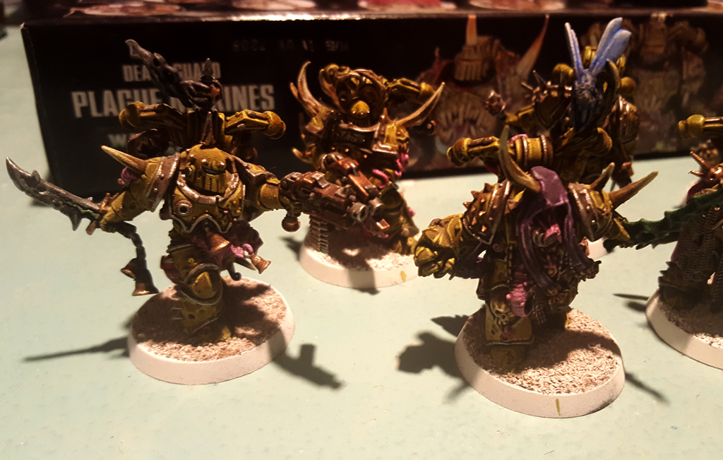 Thankfully, I’m at the stage now where I’m about to seal the paint on these Plague Marines, so I won’t have to worry about paint rubbing off anymore. I’m going to use ‘Ardcoat for the main varnish and Lahmian Medium to take the shine off. That should protect the paint job pretty well. I’ll post again once I’ve gotten them done.